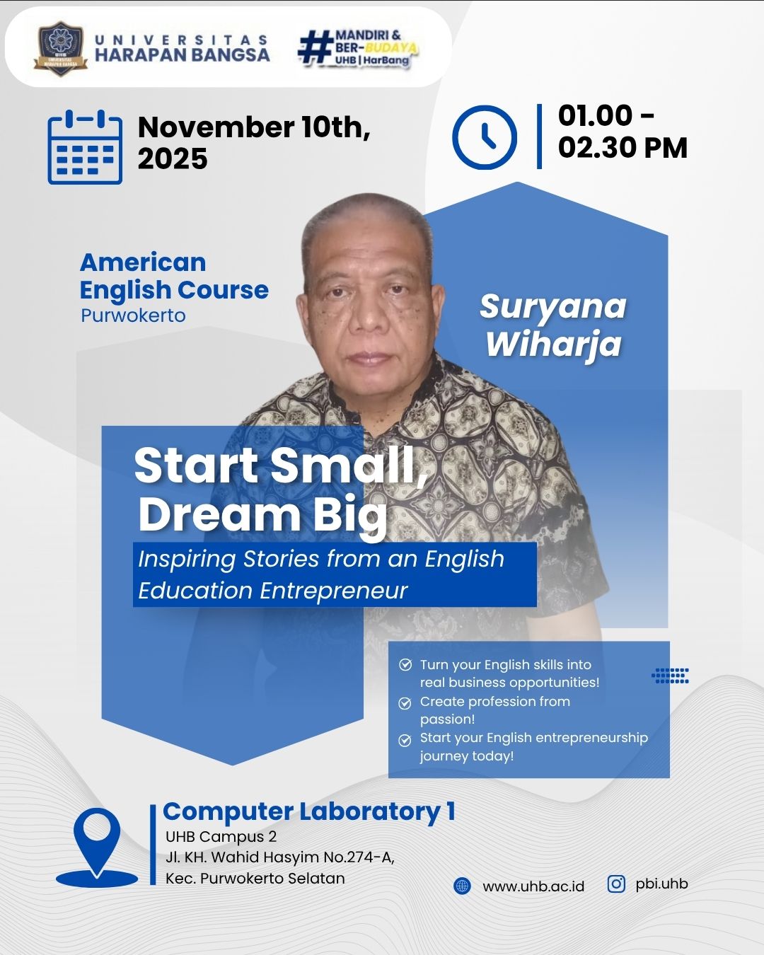 Universitas Harapan Bangsa (UHB) kembali menghadirkan kegiatan inspiratif melalui kuliah pakar bertema “Start Small, Dream Big: Inspiring Stories from an English Education Entrepreneur” pada Senin, 10 November 2025, di Laboratorium Komputer Kampus 2. Menghadirkan Suryana Wiharja, Director of American English Course Purwokerto, acara ini menjadi wadah bagi mahasiswa Program Studi S1 Pendidikan Bahasa Inggris untuk belajar langsung dari sosok yang sukses membangun usaha pendidikan dari nol.