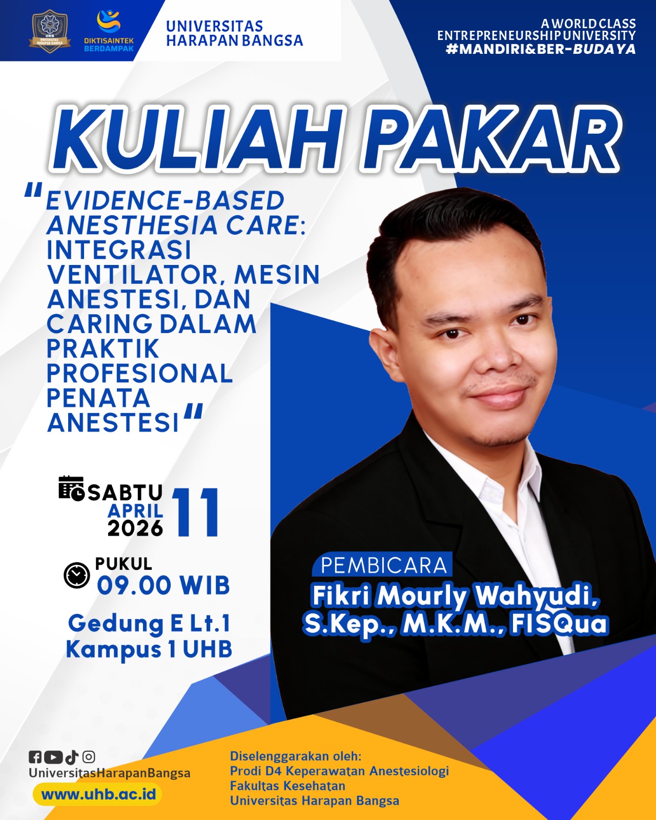 Program Studi D4 Keperawatan Anestesiologi Universitas Harapan Bangsa (UHB) menyelenggarakan Kuliah Pakar bertajuk Ventilator Mesin Anestesi dan Praktik Caring pada Sabtu, 11 April 2026. Kegiatan yang berlangsung di Aula Gedung E Kampus 1 UHB ini bertujuan membekali mahasiswa dengan pemahaman mendalam mengenai mekanika ventilasi modern sekaligus menjaga esensi kemanusiaan dalam pelayanan kesehatan yang kritis.