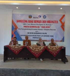 Konseling bagi remaja dan orangtua bertema 1001 Cara Bicara Orangtua ke Remaja digelar pada 25 November 2025 di Balai Desa Karangkedawung, Sokaraja, Banyumas, menghadirkan Dr. Susilo Rini SST M.Kes dari Universitas Harapan Bangsa dan staf BKKBN Kabupaten Banyumas untuk memperkuat pola komunikasi keluarga sebagai upaya menjawab tantangan pengasuhan di era digital. Kegiatan melibatkan orangtua dan masyarakat yang tergabung dalam pemuda karang taruna sebagai ruang belajar bersama mengenai pola asuh dan komunikasi efektif.