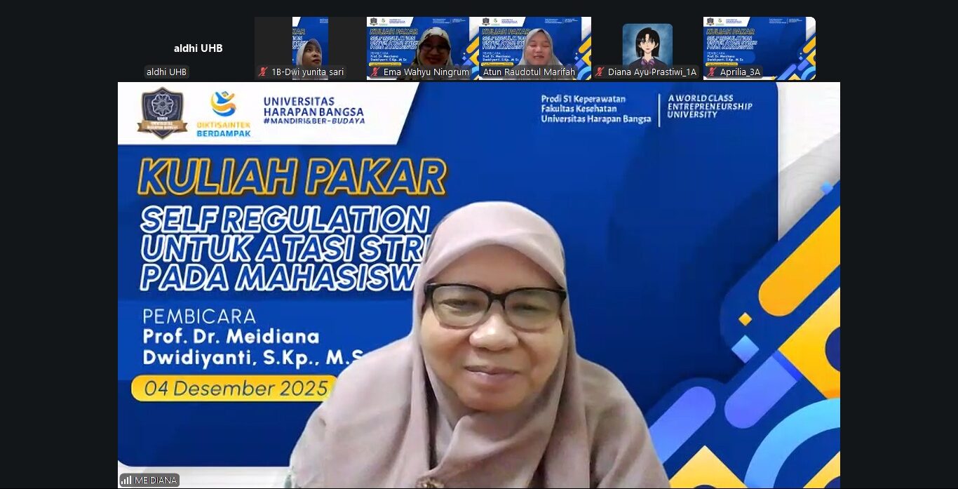 Universitas Harapan Bangsa menggelar kuliah pakar bertema Self Regulation untuk Atasi Stress pada Mahasiswa pada Kamis 4 Desember 2025 melalui Zoom Meeting, menghadirkan Prof. Dr. Mediana Dwidiyanti, S.KP., M.Sc., guna membekali mahasiswa Fakultas Kesehatan dengan keterampilan mengelola emosi dan tekanan akademik berdasarkan teknik regulasi diri yang aplikatif. Acara dipandu Dr. Ema Wahyu Ningrum dan dibuka oleh Kaprodi S1 Keperawatan dan Profesi Ners, Dr. Atun Raudotul M.S.Kep., Ns., M.Kep., Sp.Mat sebagai bagian dari upaya memperkuat kesehatan mental mahasiswa.